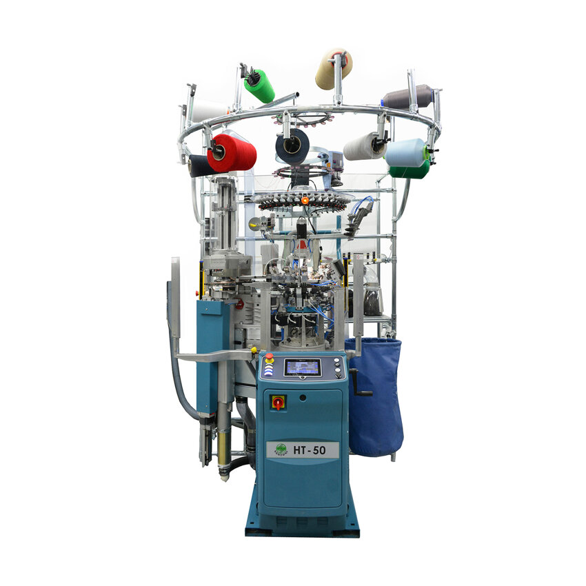 Single-cylinder machine with one feed for the production of heavy socks in terry with 4 colors plus ground on the same course. Possibility of knit or laid-in elastic. Thanks to its high technological content, the HT-50 combines productivity and quality with extreme ease of use. On request: automatic toe-closing by Santoni SbyS device, which uses the “true linking” technology, whose advantages are widely known: the sock is of superior quality in terms of finishing, comfort, durability, compared to that produced with traditional methods.