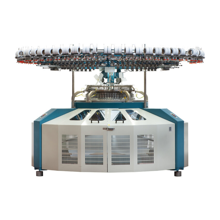 Single jersey machine with 3 feeders per diameter inch capable to knit up to 4 track structures, with/without lycra.
