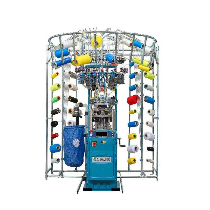 La testa tessile della macchina è equipaggiata di camme e di una speciale catenaria (brevettate) con le quali si realizza una lavorazione ad “ago annegato” che permette il passaggio all’interno della camma maglia ai soli aghi che concorrono alla formazione dell’articolo.